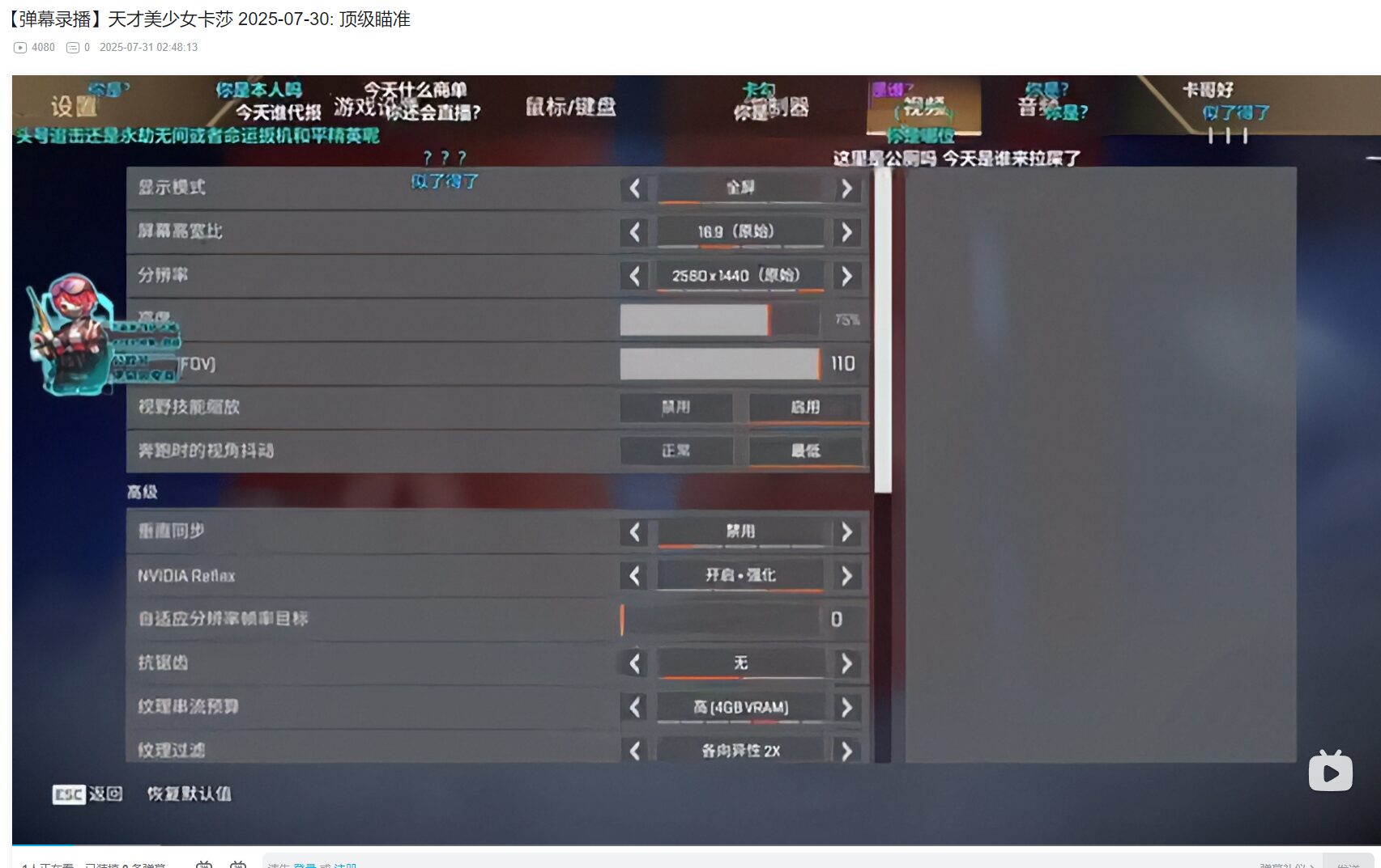 グラフィック設定に関してはbilibili動画の「DetectiveLemon」というユーザーが卡莎(kasssa)選手の配信アーカイブを大量に残しており、その中から再びグラフィック設定を見せてみせているシーンを探すのは困難ですが、しっかりと確認した上で載せている情報になります。